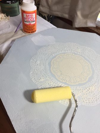 Now. I know I wanted to keep this project a table, but the glass was to destroyed to reuse and to pay for another piece to be cut to fit would take time and cost a pretty penny. If you know me I’m CHEAP so spending a pretty penny on just a piece of glass when I could find a creative and cheaper way to make this table beautiful again was silly! I took a night and went to my favorite place, Lowes! I looked at time, flooring, and even frosted window clings. I had no clue of what to do with the top. everything was so expensive! Finally I decided to paint the top and use my good old favorite thing to use (Modge Podge). I found some doilies and wanted to make a elegant design in the middle of the table top to give it that elegant style.