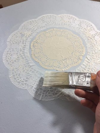 Fifth Step: After the whole top was painted it was time to get the doilies ready. I didn’t want to use white doilies, thinking it would clash with the antque lace color on the pedistol… So I decided to also paint the doilies with the antique lace chalk paint.